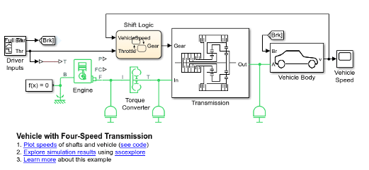 Блок Stateflow, который помечен как Shift Logic, реализует выбор передач для трансмиссии. Блок определяет, следует ли перемещать вверх или вниз на основе входных данных двух других компонентов модели. Блок входов машиниста выдает информацию о дросселе и торможении. Подсистема кузова транспортного средства обеспечивает скорость кузова транспортного средства по контуру обратной связи.