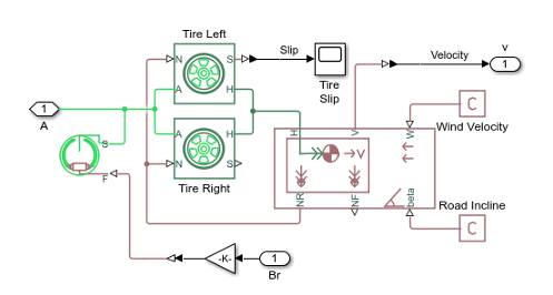Шины вращаются неидеально, проскальзывая, прежде чем они полностью создают тягу и реагируют на дорожное покрытие. Проскальзывание левой шины сообщается как физический сигнал и преобразуется в Simulink для использования в области проскальзывания шины.