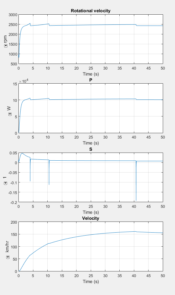 Последовательность линий соединения трансмиссии модели заканчивается блоком «Кузов транспортного средства», который определяет геометрию транспортного средства, массу, аэродинамическое сопротивление и начальную скорость (ноль). Этот блок генерирует нормальные силы, которые блоки шины принимают как вертикальные нагрузки. Корпус транспортного средства принимает развиваемую тяговую силу и движение в его горизонтальном поступательном отверстии (Н). Модель кузова транспортного средства также принимает скорость ветра (W) и наклон дороги (бета), которые обеспечиваются физическими константами.