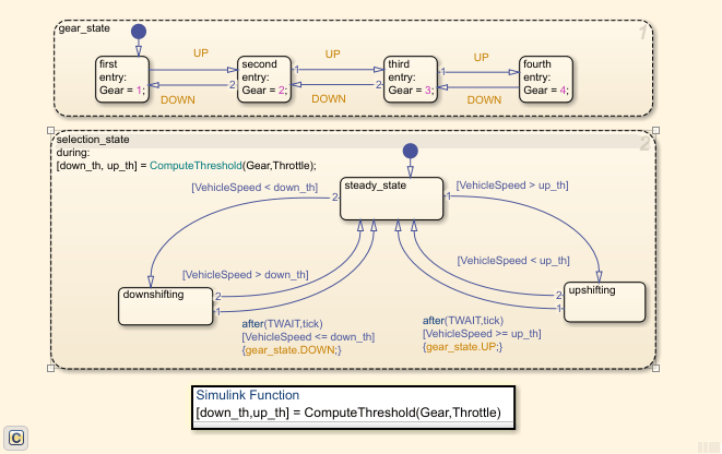 Модель вычисляет пороги скорости повышающей и понижающей передач как функцию мгновенных значений зубчатой передачи и дроссельной заслонки. Пока в steady_stateмодель сравнивает эти значения с текущей скоростью транспортного средства, чтобы определить, требуется ли сдвиг. Если это так, он входит в одно из состояний подтверждения (повышающая или понижающая передача), в котором записывается время ввода.