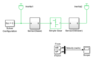 Измените созданную модель, связав две вращающиеся инерции с простой идеальной шестерней с фиксированным передаточным отношением.
