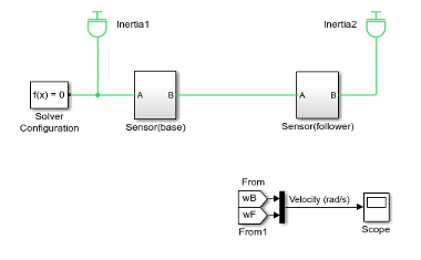 Перезапустите моделирование. Две угловые скорости составляют 3,14 и -3,14 радиана/с для Inertia1 и Inertia2 соответственно. Вторая угловая скорость та же, но с противоположным знаком, потому что два тела вращаются в противоположных направлениях.