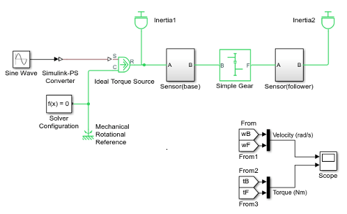 В окончательной версии модели простой передачи инерции приводятся в действие внешним крутящим моментом вместо запуска с фиксированными начальными угловыми скоростями. Внешний крутящий момент изменяется синусоидально. Вы можете найти завершенную версию этой модели в sdl_gear пример модели.