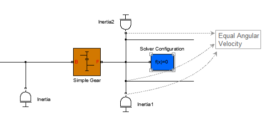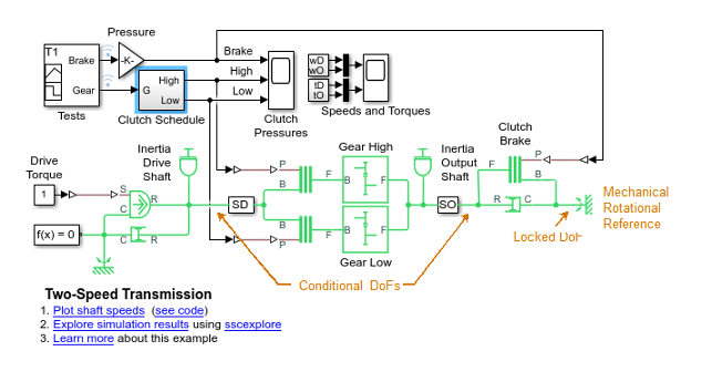 Если один из этих блоков переключения передач заблокирован, дополнительное ограничение уменьшает систему до одного независимого DoF, все слева от блока торможения сцепления. (График управления сцеплением настроен, чтобы предотвратить одновременную блокировку обоих этих блоков сцепления.)