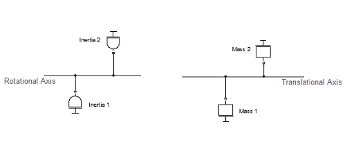 Невозможно подвергнуть линию соединения трансмиссии каким-либо крутящим моментам или силам, поскольку ей не хватает инерции или массы. Другим базовым элементом для построения функционирующей модели трансмиссии является один или несколько блоков инерции, один или несколько блоков формообразующих элементов или оба. В реальной механической системе вращающиеся (или скользящие) тела несут как инерцию (или массу), так и DoF.