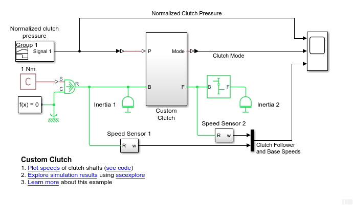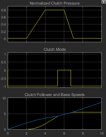 Сигнал режима сцепления указывает относительное движение двух соединенных валов. От 0 до 5,32 секунды два вала перемещаются относительно друг друга. Ведомый (ведомый) вал медленнее базового (ведущего) вала, поэтому сигнал режима равен -1. Как только два вала блокируются, их относительная скорость равна 0, и сигнал режима переключается на 0. Через 6,73 секунды они разблокируются, и ведущий (базовый) вал начинает ускоряться быстрее, чем ведомый (ведомый) вал. Сигнал режима переключается обратно в -1.