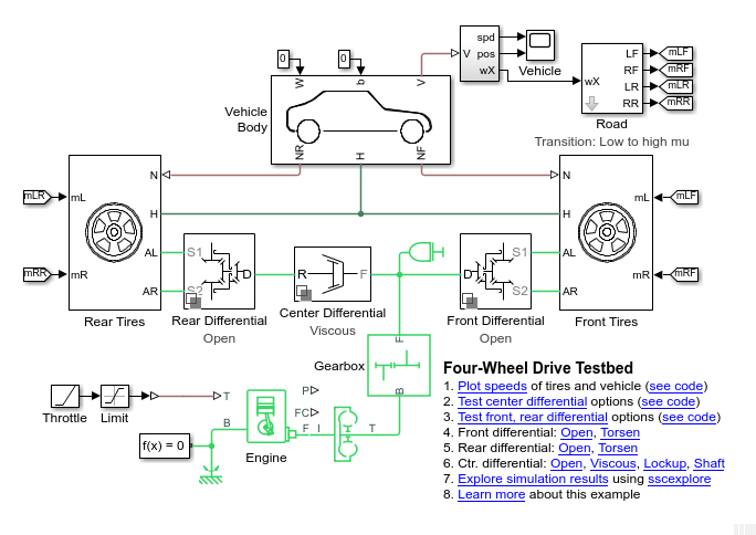 В этом примере показано, как изменять дорожные условия при моделировании испытательного стенда 4-х приводного транспортного средства. Модель представляет собой версию sdl_vehicle_4wd_testbed, которая обновлена для включения блоков профиля дороги как для передних, так и для задних шин. При движении транспортного средства параметры оси и положение центра тяжести (CG) определяют положение передней и задней осей. Блоки «Профиль дороги» используют положения оси для определения коэффициентов трения по углу транспортного средства и шинам на основе заданных параметров.