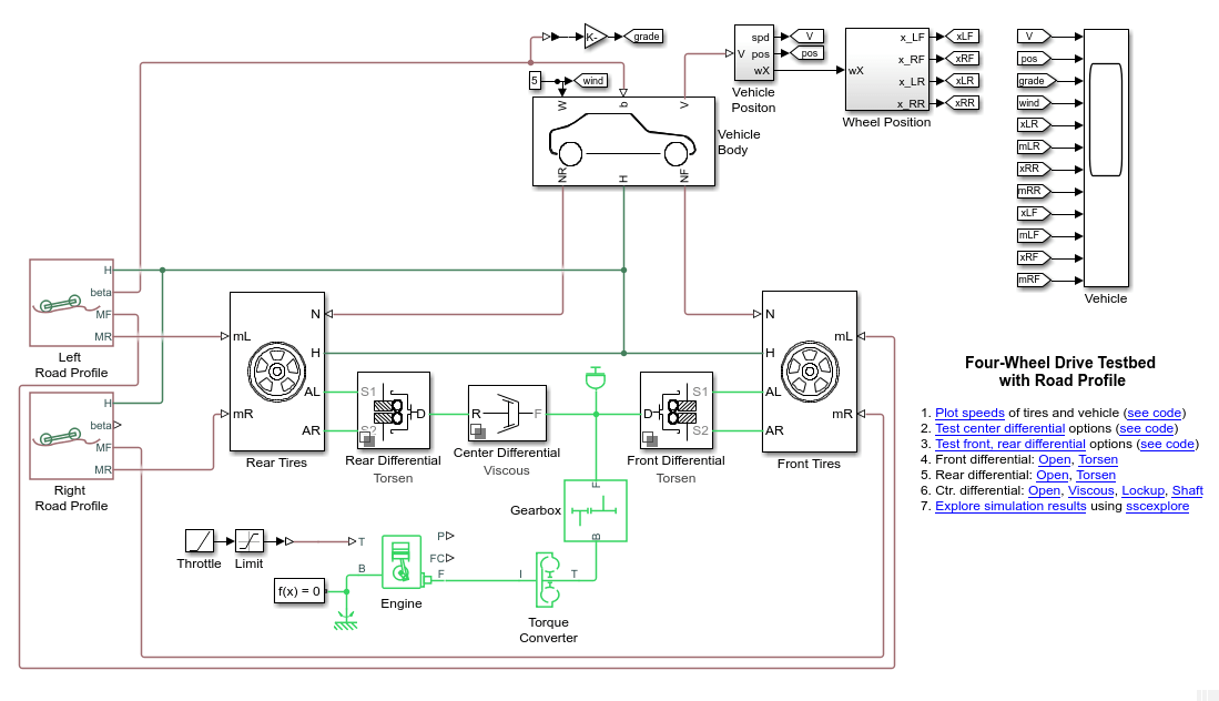Новая модель включает блоки профиля дороги как для правых, так и для левосторонних шин. Для открытия модели в командной строке MATLAB введите