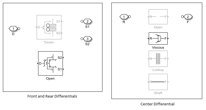 В обеих моделях передний, задний и центральный дифференциалы представлены вариационными подсистемами.