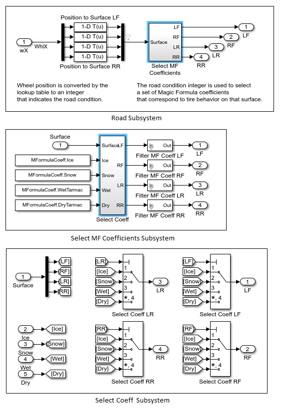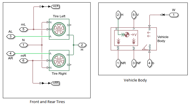 Передняя и задняя подсистемы шин содержат блоки Tire (Magic Formula), в то время как подсистема Vehicle Body является маской для блока Vehicle Body.