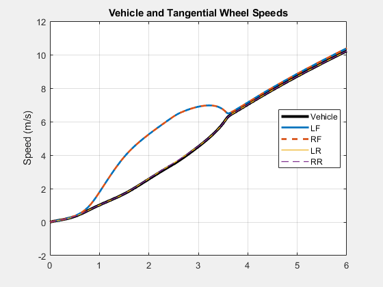 Передние шины испытывают проскальзывание в середине моделирования из-за скользких условий, связанных с [4 2 0.1 1] Магические коэффициенты, которые используются при моделировании, когда положения передних шин находятся в 5-10 метрах от исходных положений.