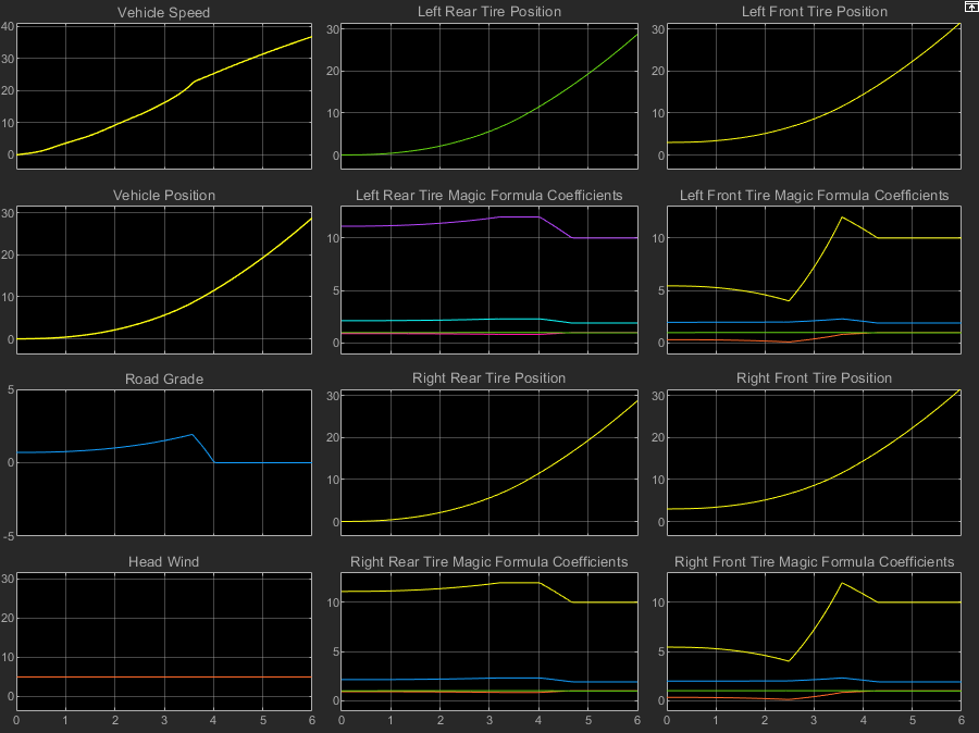Чтобы увидеть, как наклон дороги, встречный ветер, положение шины, скорость и положение транспортного средства соотносятся друг с другом и с магическими коэффициентами, откройте блок Scope.