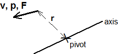 В общем случае механические системы смешивают вращательное и поступательное движение. Вращательная динамика и движение вокруг оси связаны с поступательной динамикой и движением (скорость v, импульс p, сила F) на некотором расстоянии (плечо r момента) от поворотного шарнира через ограничение, которое фиксирует только движение, перпендикулярное плечу момента.