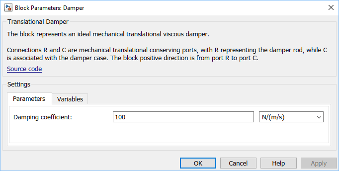 Дважды щелкните на блоке «Демпфер». Установить его коэффициент демпфирования равным 100 N/(m/s).