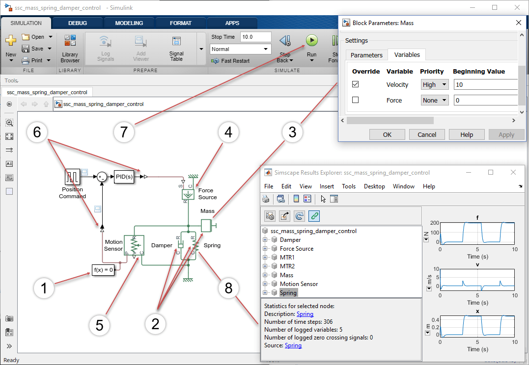 На рисунке показаны ключевые шаги рабочего процесса, примененные к модели примера Mass-Spring-Damper с контроллером. Ниже приведены подробные инструкции по созданию этой модели.