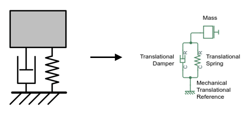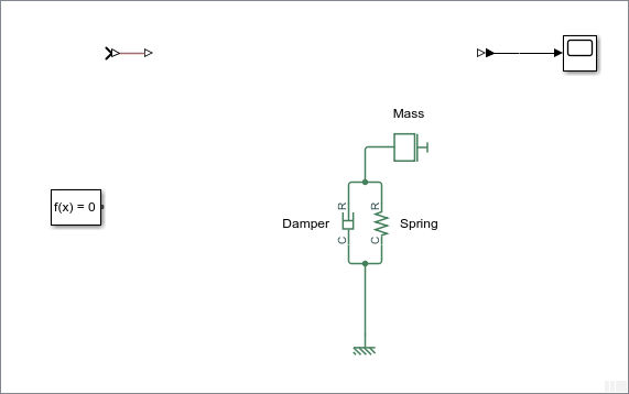 Перетащите блоки «Масса», «Поступательная пружина», «Поступательный демпфер» и «Механическая поступательная привязка» в окно модели.