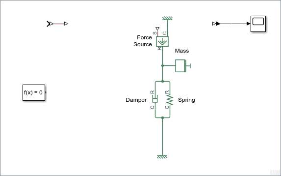 Подключите порт C блока источника силы ко второму блоку механической поступательной привязки и порт R к блоку массы, как показано ниже.