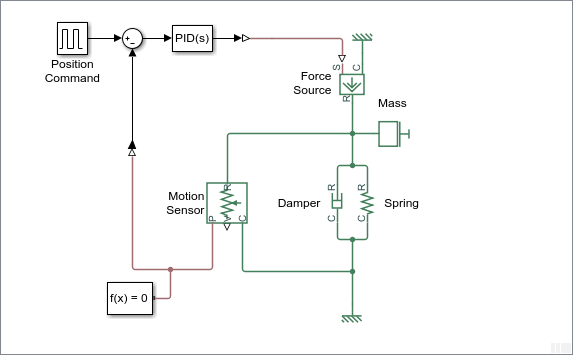 Выходной порт P блока датчика идеального поступательного движения, измеряющего деформацию пружины, подключается к блоку преобразователя PS-Simulink. Этот блок преобразует физический сигнал в сигнал Simulink обратной связи для контроллера.