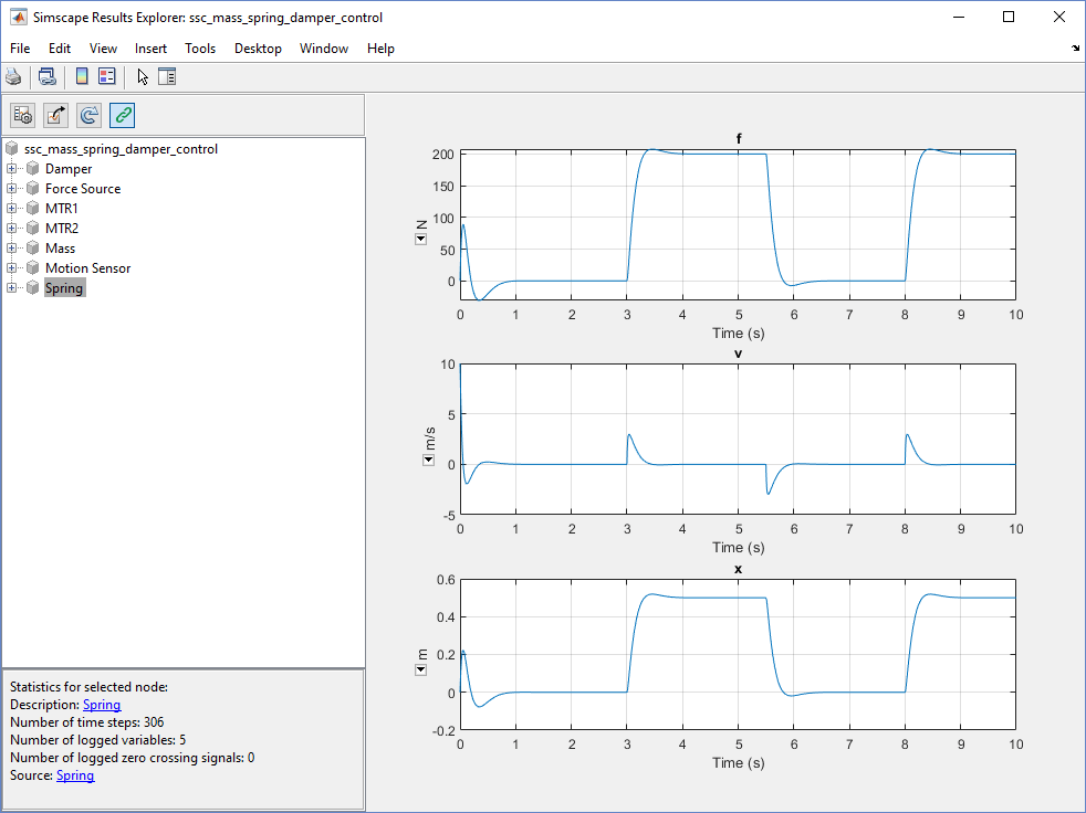 Откроется окно Simscape Results Explorer, на левой панели которого будет выделен узел, соответствующий блоку «Пружина». На правой панели отображаются графики данных моделирования для трех переменных, связанных с блоком.