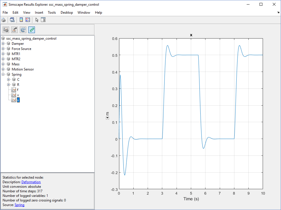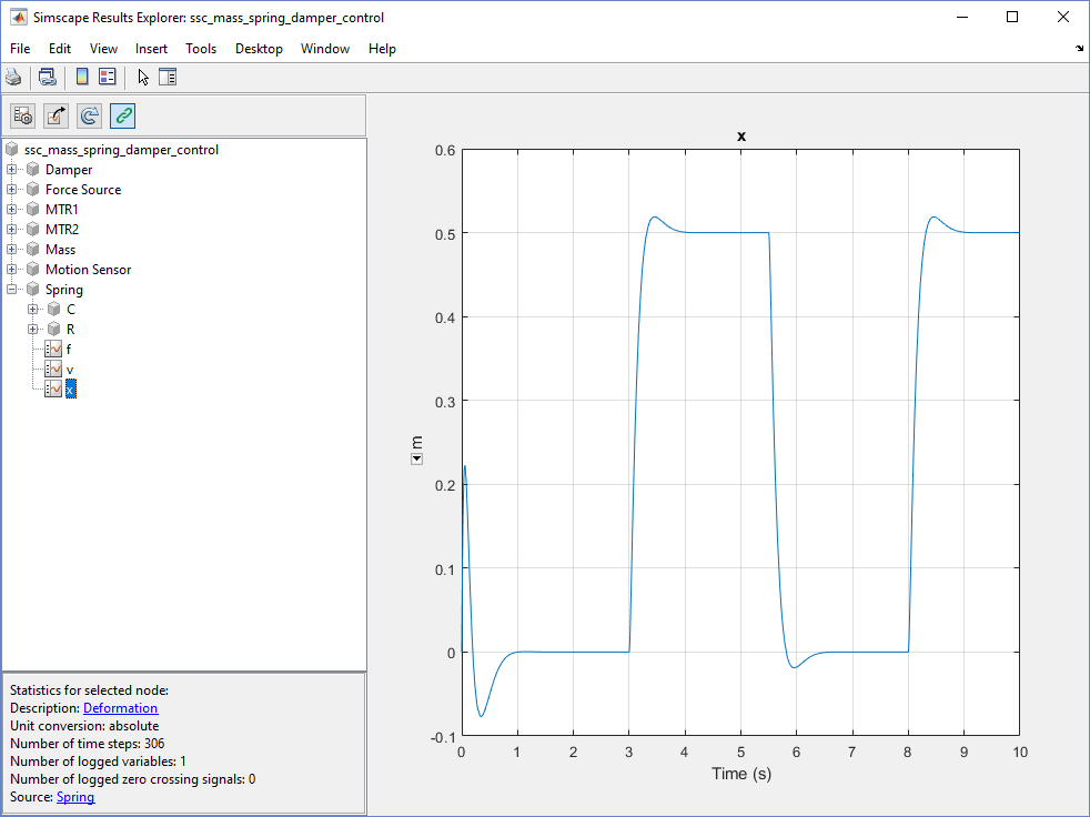 Разверните окно Spring узел и выберите узел x. На правой панели отображаются данные деформации пружины, выводимые на печать с течением времени.