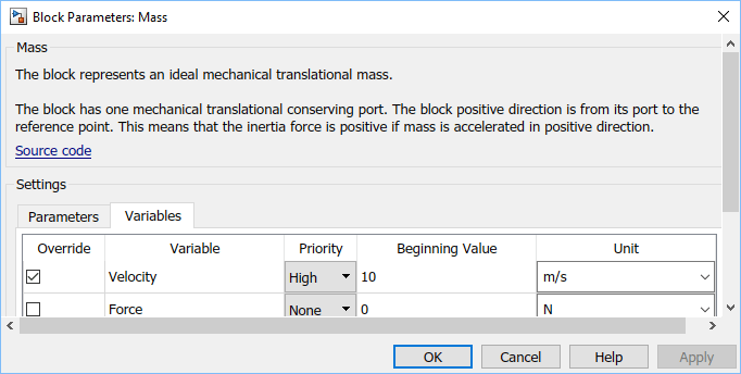 Чтобы задать требуемое начальное значение для массовой скорости, перейдите на вкладку Переменные (Variables). Переменная Velocity уже имеет приоритет, указанный как High. В поле Начальное значение введите 10и нажмите кнопку «Применить».