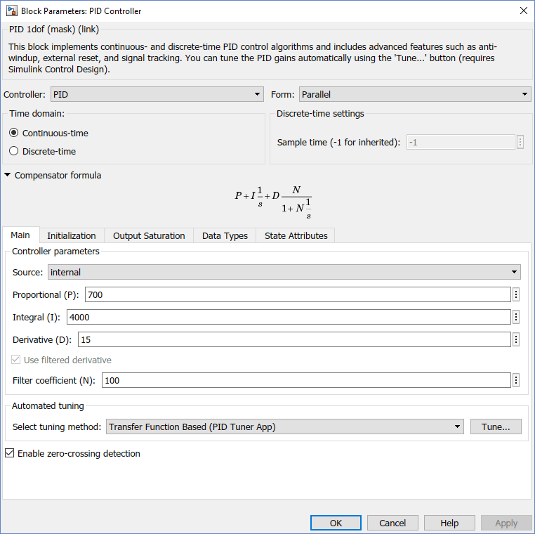 Откройте библиотеку Simulink > Continuous и перетащите блок PID Controller в модель. Задайте значения параметров Пропорциональная (P), Интегральная (I) и Производная (D), как показано на рисунке.