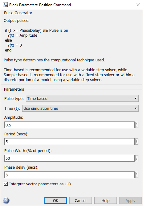 Откройте библиотеку Simulink > Sources и перетащите блок генератора импульсов в модель. Измените имя блока на «Position Command». Задайте параметры блока, как показано на рисунке.