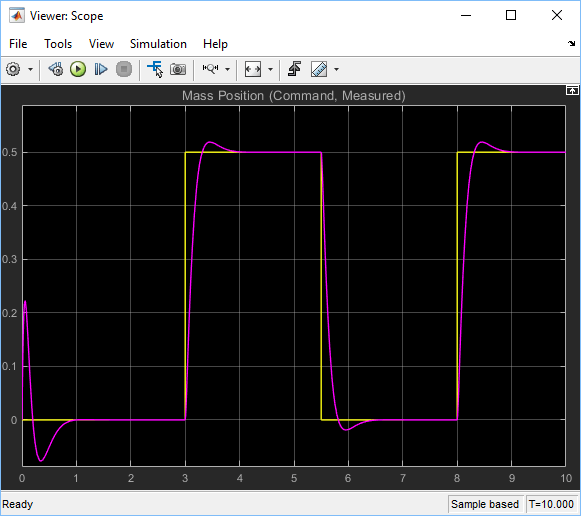 (Run) на панели инструментов Simulink Toolstrip (вверху окна модели) или на панели инструментов Scope Viewer. Решатель Simscape оценивает модель, вычисляет начальные условия и выполняет моделирование. Подробное описание этого процесса см. в разделе Как работает Simscape Simulation. Сообщение в левом нижнем углу окна модели предоставляет обновление статуса.