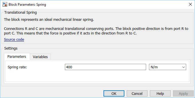 Дважды щелкните на блоке «Пружина». Установите для параметра «Скорость пружины» значение 400 N/m.
