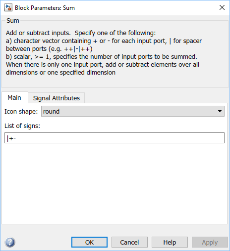 Откройте библиотеку Simulink > Math Operations и перетащите блок Sum в модель. В Списке знаков замените второй знак «плюс» на знак «минус», как показано на рисунке.
