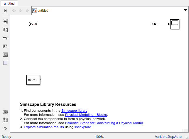 Новая модель без названия со значением решателя по умолчанию VariableStepAutoсодержит блок конфигурации решателя, блок преобразователя Simulink-PS и блок преобразователя PS-Simulink, подключенный к блоку Scope.