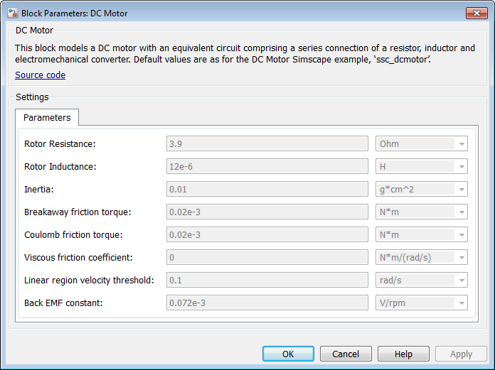 % Default values are as for the DC Motor Simscape example, ssc_dcmotor.