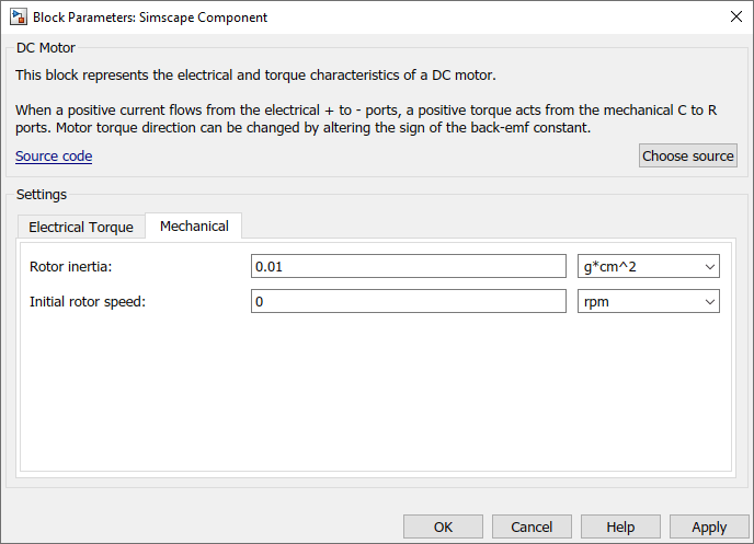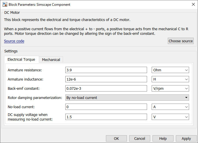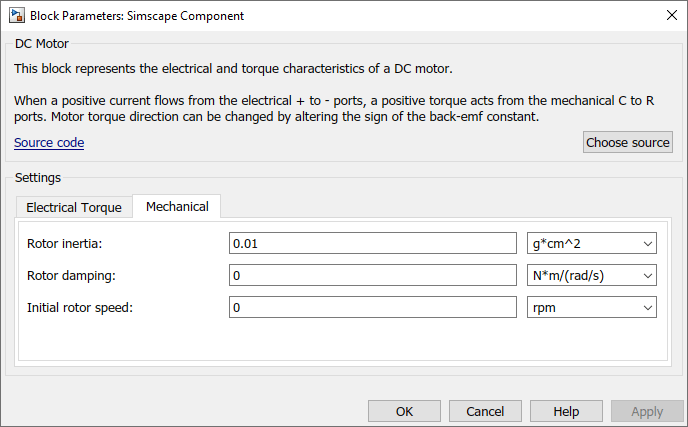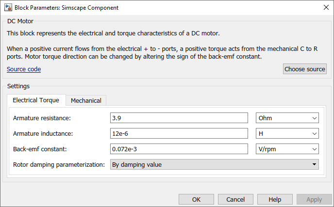 Кроме того, DCMotorWithTabs компонент обеспечивает два способа задания демпфирования ротора: