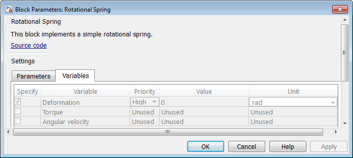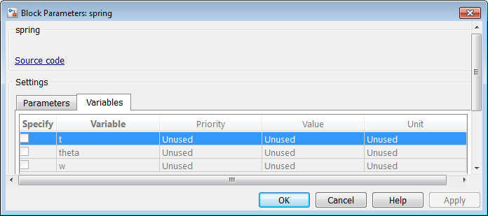 Используйте тот же метод, чтобы указать значимые имена для открытых переменных верхнего уровня компонента. Эти переменные появляются на вкладке «Переменные» диалогового окна блока, и предоставление им описательных имен помогает при инициализации переменной уровня блока перед моделированием.