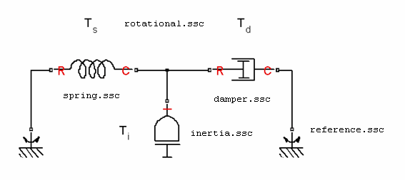Домен объявлен в файле с именем rotational.ssc (см. раздел Объявление области механического вращения). Следующий файл с именем spring.ssc, объявляет компонент, называемый пружиной. Компонент содержит: