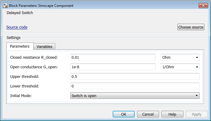Значение параметра начального режима: Switch is open. Это перечисляемое значение равно 0, что делает предикат в initial раздел true. Поэтому в начале моделирования переключатель разомкнут и ток через резистор R1 не протекает. Когда значение управляющего сигнала достигает 0,5 (верхнее пороговое значение параметра), переключатель закрывается, и ток через ветвь, основанный на других значениях параметра, 1A. Когда управляющий сигнал падает ниже 0 (значение нижнего порогового параметра), переключатель выключается.