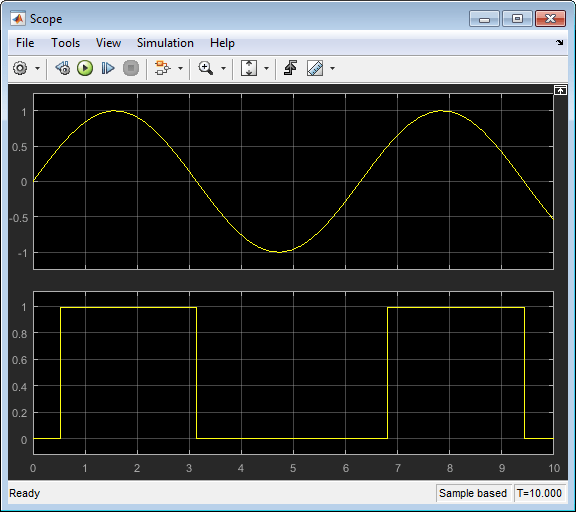 Теперь измените значение параметра Начальный режим на Switch is closed и смоделировать модель. Перечисляемое значение равно 1, предикатное условие в initial раздел больше не соответствует действительности, и поэтому первый режим указан в modes раздел активен. В начале моделирования переключатель замыкается и остается замкнутым до тех пор, пока управляющий сигнал не упадет ниже 0.