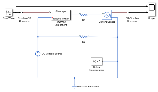 Чтобы проверить правильность поведения компонента, разверните его в блоке компонента Simscape. Создайте простую тестовую модель, как показано на рисунке, со всеми блоками, использующими значения параметров по умолчанию.