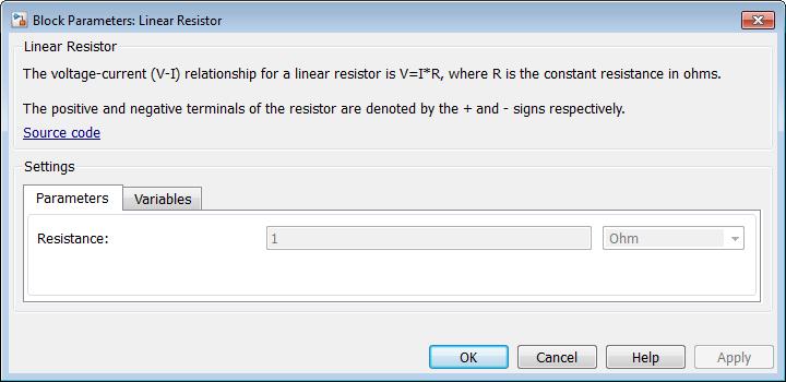 Параметр R, со значением по умолчанию 1 Ohm, указывая значение сопротивления. Этот параметр появляется в диалоговом окне блока, созданного из файла компонента, и может быть изменен при построении и моделировании модели. Комментарий, следующий непосредственно за объявлением параметра, Resistanceопределяет способ отображения имени параметра блока в диалоговом окне.