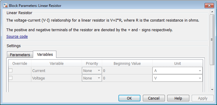Все открытые переменные компонента отображаются на вкладке «Переменные» диалогового окна блока, созданного из файла компонента. Чтобы указать, как имя переменной отображается в диалоговом окне, используйте комментарий сразу после объявления переменной (Current и Voltage).