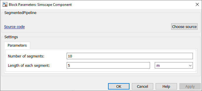 В этом примере для простоты SegmentedPipeline компонент имеет только два изменяемых параметра: N (количество сегментов) и segm_length (Длина каждого сегмента). Однако можно сделать другие параметры нижележащего блока трубы (IL) доступными из диалогового окна составного блока верхнего уровня, как описано в разделе Параметризация составных компонентов. Параметр N, который определяет размер массива и будет использоваться в качестве верхнего предела для for итератор цикла объявлен как целое число без единиц измерения.