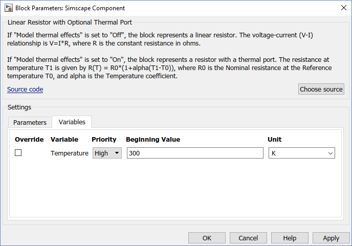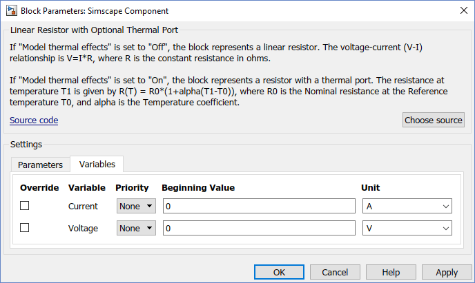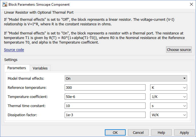 Если для параметра управления «Тепловые эффекты модели» задано значение Offблок представляет линейный резистор. Единственным открытым параметром блока является Номинальное сопротивление (Nominal resistance), вкладка Переменные (Variables) позволяет задать целевые значения тока и напряжения, а значок блока имеет два порта, + и -.