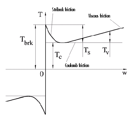 Трение Стрибека, TS, - это отрицательно наклоненные характеристики, происходящие при низких скоростях (см. [1]). Кулоновское трение, TC, приводит к постоянному крутящему моменту при любой скорости. Вязкое трение, TV, противодействует движению с крутящим моментом, прямо пропорциональным относительной скорости. Сумму трений Кулона и Стрибека в окрестности нулевой скорости часто называют трением отрыва, Tbrk. Трение аппроксимируется следующими уравнениями: