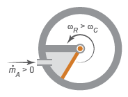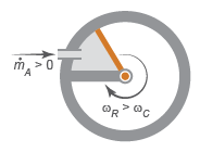 Pressure at A causes negative rotation of R relative to C - Увеличение объема жидкости приводит к отрицательному вращению канала R относительно канала C.