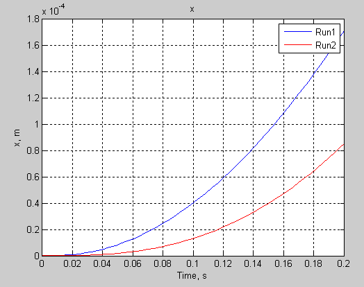 simscape.logging.plot({simlog1.TS.x simlog2.TS.x},'names',{'Run1' 'Run2'});