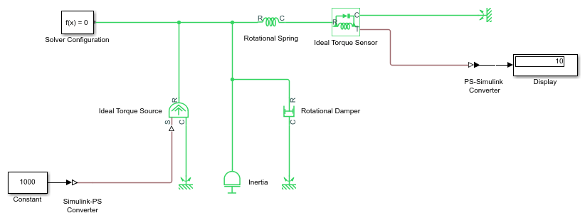 На диаграмме ниже блок идеального источника крутящего момента ожидает сигнал крутящего момента в N * m на своем S-порте. Блок источника константы обеспечивает значение для этого входного сигнала. Если оставить блок преобразователя Simulink-PS без единиц измерения, то блок источника идеального крутящего момента создаст крутящий момент 1000 Н * м. Параметры других блоков в этом примере выбираются таким образом, чтобы выходное значение блока датчика идеального крутящего момента было равно крутящему моменту, генерируемому блоком источника идеального крутящего момента, и поэтому блок дисплея будет показывать значение 1000. При изменении значения параметра единицы входного сигнала в блоке Simulink-PS Converter наN*cmменеджер блока выполняет преобразование, и блок источника идеального крутящего момента генерирует крутящий момент 10 Н * м; значение крутящего момента в блоке Display изменяется на 10, как показано на диаграмме.