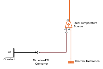 Например, в блоке Simulink-PS Converter, показанном на следующей схеме, если ввести degC в поле Input signal unit и установите флажок Apply affine conversion (Применить аффинное преобразование), температура, генерируемая блоком Ideal Temperature Source (Источник идеальной температуры), равна 293,15 К. Однако, если флажок Apply affine conversion (Применить аффинное преобразование) снят, то выходной сигнал блока Ideal Temperature source source (источник) равен 20 К..