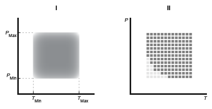 2D tables based on temperature and pressure - Предоставить табличные данные по температуре и давлению. Область допустимых температур и давлений определяется в терминах минимального и максимального значений (I на рисунке) или в терминах матрицы достоверности (II).