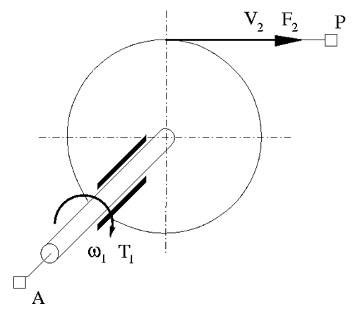 Колесо и ось имеют одну и ту же ось, и предполагается, что ось жестко соединена с рамой, что делает этот механизм идеальным преобразователем механического вращения в механическое поступательное движение. Механизм имеет два соединения: механическое поворотное отверстие А, которое соответствует оси, и механическое поступательное отверстие Р, которое соответствует периферии колеса. Механизм описывается следующими уравнениями: