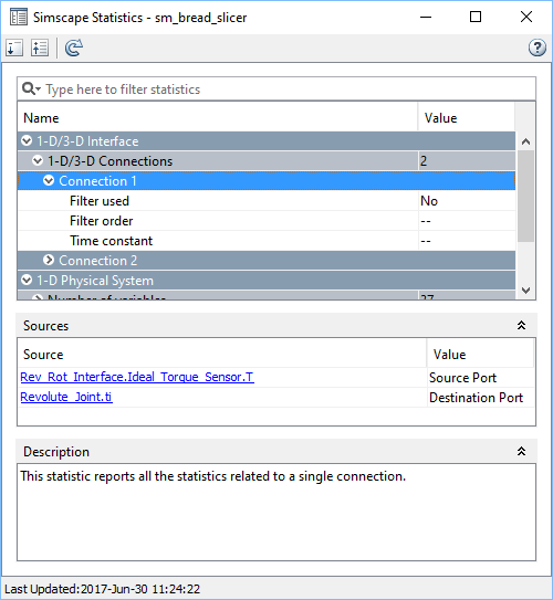 Этот узел перечисляет статистику, связанную с интерфейсом между всеми 1-D физическими и 3D системами мультитела, существующими в модели. Она появляется только для моделей, которые соединяют блоки из библиотеки Simscape™ Multibody™ с блоками из библиотек Simscape, Simscape Driveline™, Simscape Fluids™ и Simscape Electrical™, за исключением блоков Specialized Power Systems.